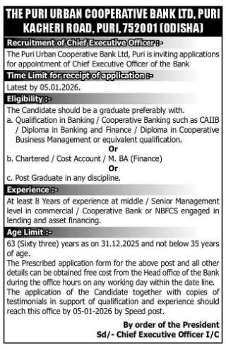 Complete guide to Puri Urban Cooperative Bank CEO recruitment 2025. Learn about eligibility, 8+ years’ experience requirement, CAIIB/MBA qualifications, application process via speed post by 05 January 2026. Age limit 35-63 years. Odisha banking jobs.